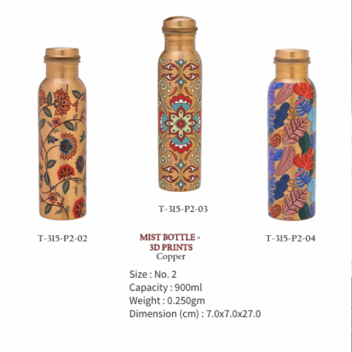 Enhance your lifestyle with our beautifully crafted Copper Mist Bottle featuring premium 3D printed artistic floral patterns. Designed for both elegance and functionality, this bottle is made from high-quality copper that is known for its durability and wellness benefits. With a 900ml capacity, it is perfect for storing water for home, office, gym, or travel use. The stylish printed finish gives it a luxurious look, making it an excellent choice for personal use or as a thoughtful gift for family, friends, employees, and clients. A perfect blend of health, tradition, and modern design for everyday use.
