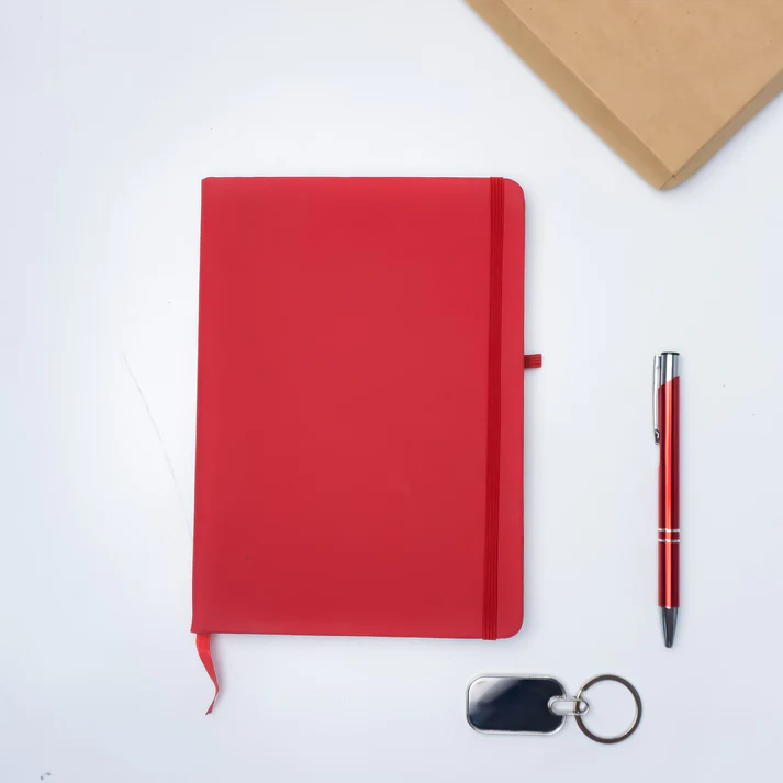 • Red Notebook (Moleskine Style): Premium notebook with an elastic closure.
