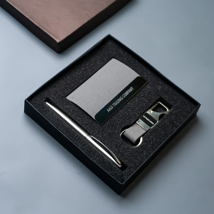 The Gift Set for Exclusive Card Holders is an upscale corporate gift that fuses elegance with practicality, offering everyday use. The gift set contents are a quality card holder with a metal finish, a quality metal pen, and a matching key chain – all designed to match a professional lifestyle. The gift set comes in a black box lined with foam and presents beautifully to clients, employees, or business associates.