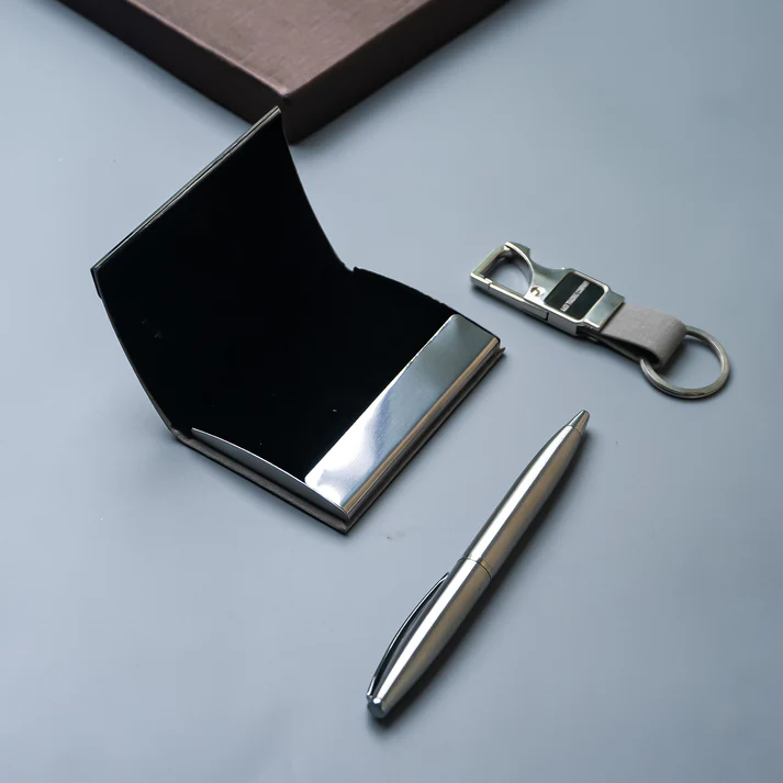 Set Consists of: Premium Card Holder with a metal and fabric finish, Metal Key chain, Quality metal ballpoint pen