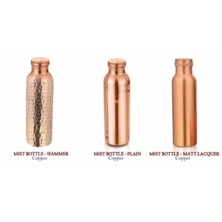 Elegant copper mist water bottle collection featuring plain, hammered, matte lacquer, silver touch, and etched finishes for stylish everyday hydration.